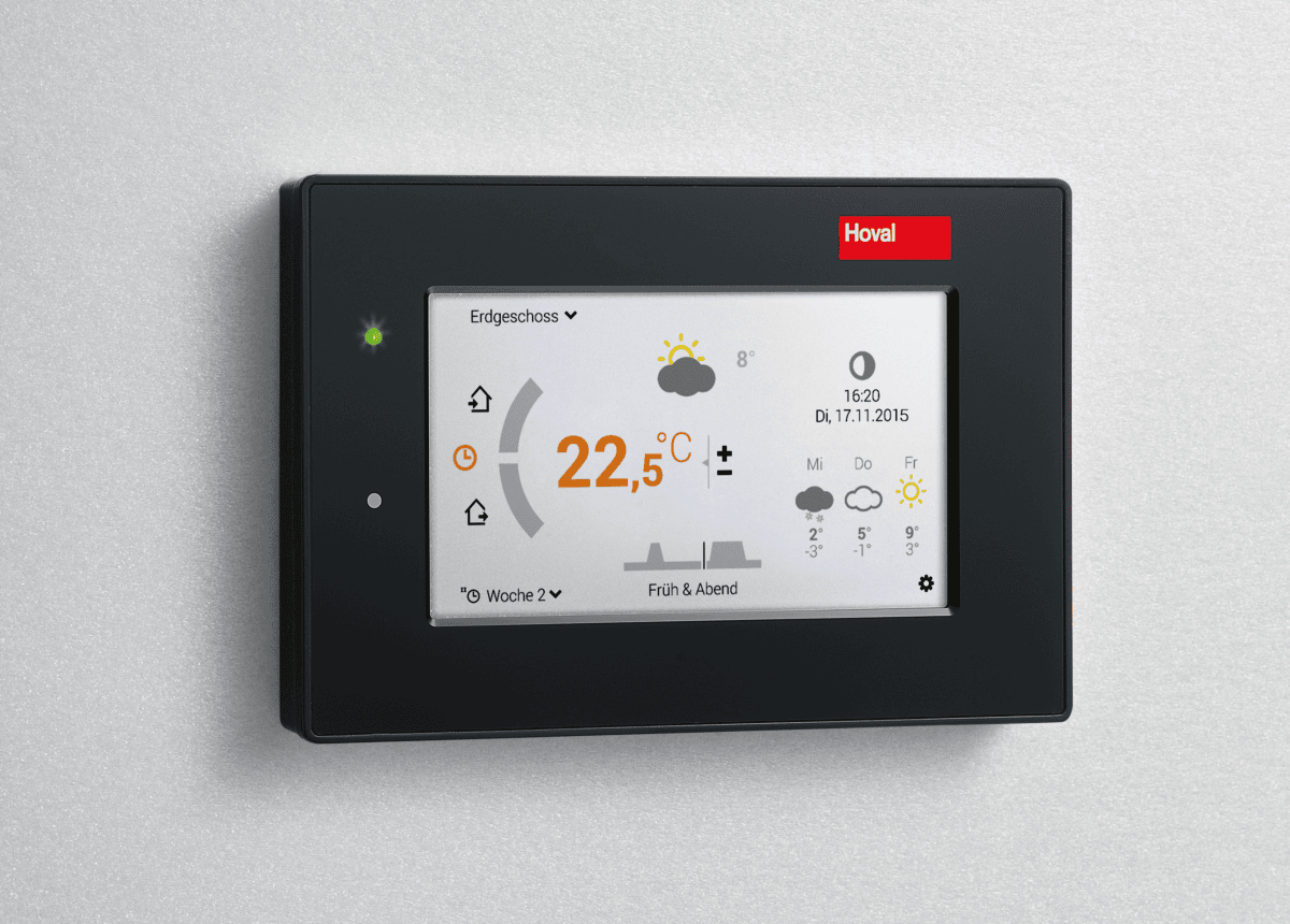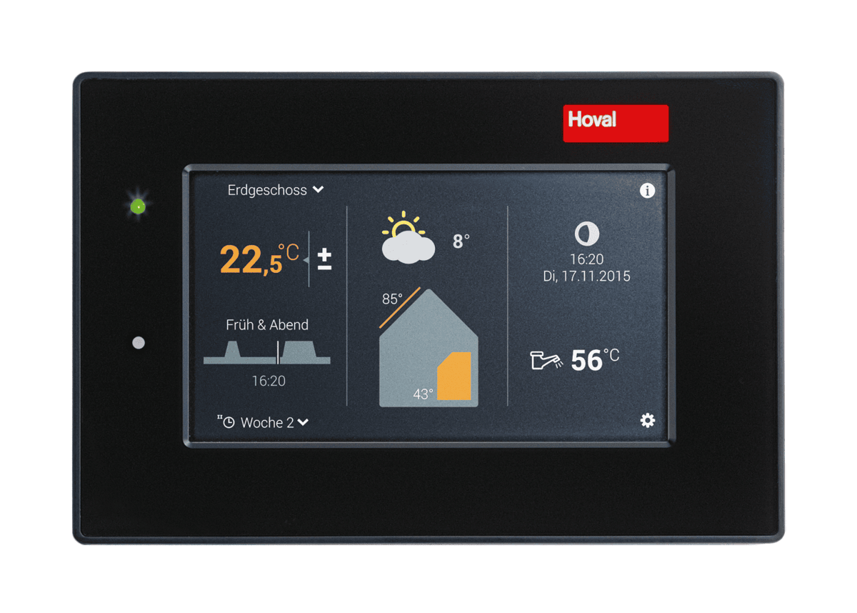 天气预报如何?Hoval TopTronic® E 控制系统使用互联网上的天气信息。每三个小时,它就会从互联网上检索您所在位置的可靠天气预报,并根据此信息进行供暖操作。您可以在保护环境和成本的同时节省能源,同时享受同等水平的舒适度。多个网关模块可用于连接到互联网。如果您想在外出时控制供暖,您可以通过智能手机上的应用程序进行控制。