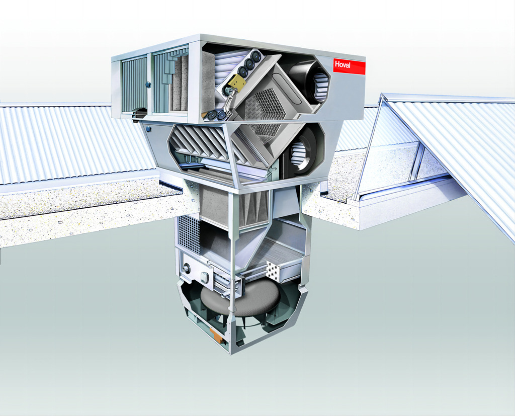 RoofVent LH是用于高大空间送风和采暖的。它可以在混风中回收排风量。专用控制系统可以优化调节新风量:在保证室内温度的情况下,让新风量刚好可以满足需要而不增加任何供热负担。新风量的最小值是可以设定的。RoofVent LH很适用于不需要大量外部新风的情况。如果您需要的新风量持续保持大于40%时,那么采用带有热能回收功能的机组将会更经济。