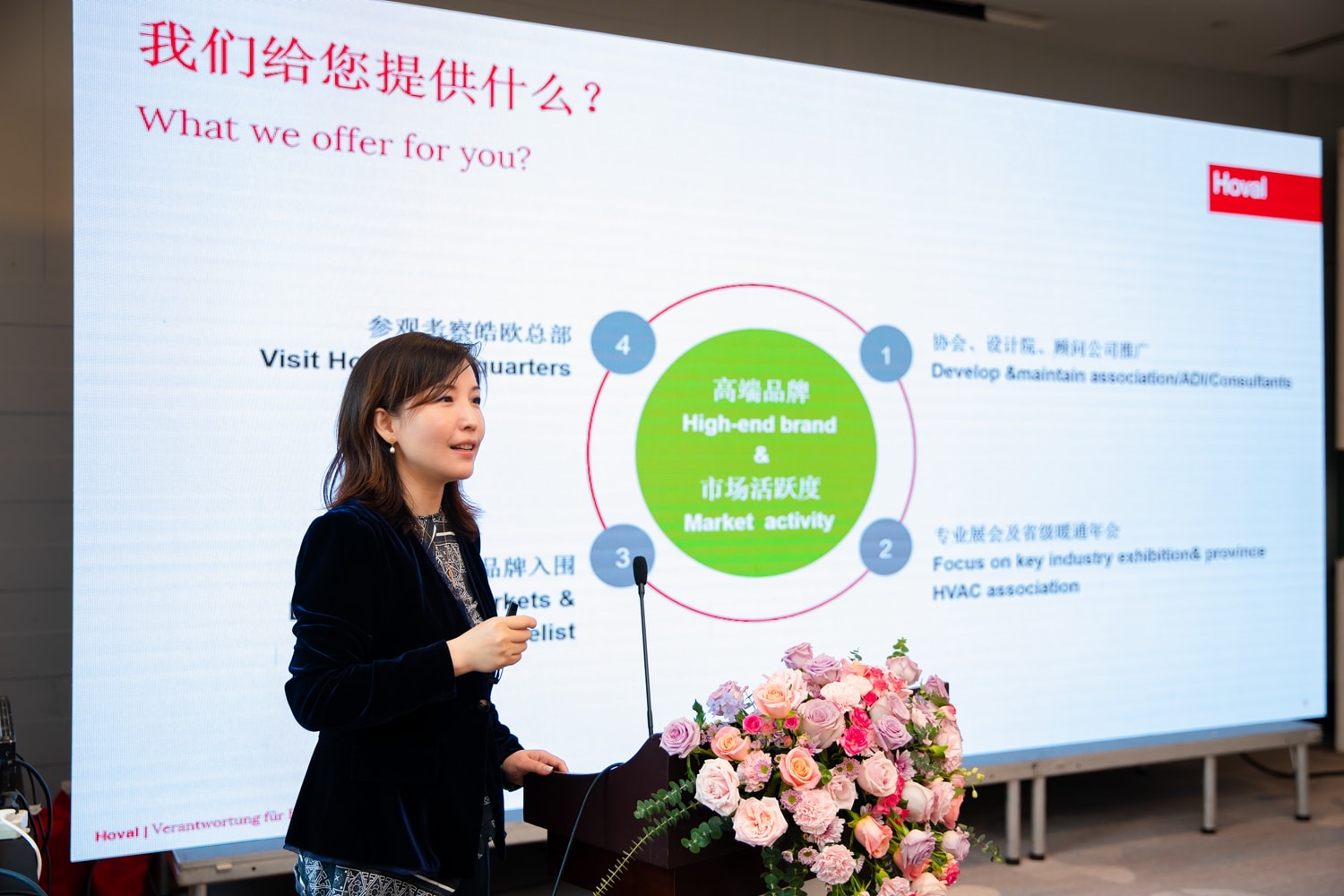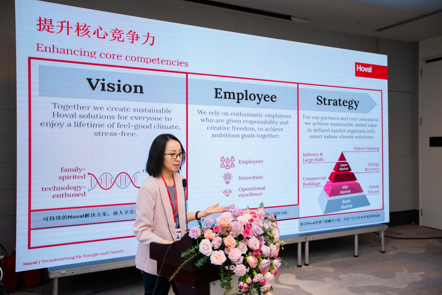 Subsequently, Ms. Chen Qian, the Sales Director of Hoval China, introduced the latest sales team and conducted a macro analysis of the overall post-pandemic environment and market conditions. She shared her thoughts on the future development of the market with the dealers, expressing her hope that Hoval and its dealers can work together, empower each other, and achieve win-win cooperation!