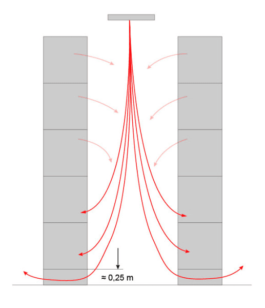 Rows of shelves restrict the rotationally symmetrical flow of torsion air distributors. The fronts of the rows of shelves act as walls as far as air flow is concerned, causing wall jets to form. These have a wider reach than open jets and a greater mounting height than is the case with free flow distribution. This increase can be up to 1.5 m.