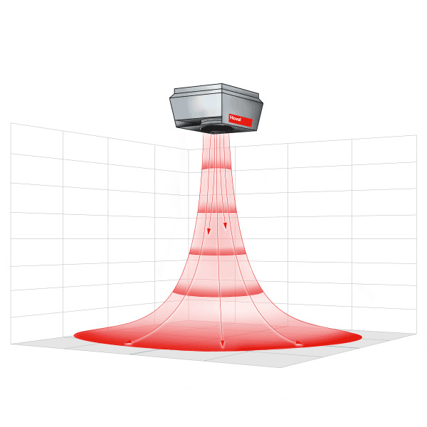 In heating mode, a highly concentrated air stream is emitted at high speed from the distributor and a negative pressure difference occurs around the air columner. As a result, the ambient air moves from the ceiling area and, to a lesser extent, from the top shelves towards the air stream. As the depth of penetration increases, the air stream slows down, the surrounding negative pressure decreases and the ambient air is induced. The flow then reaches the bottom shelves.